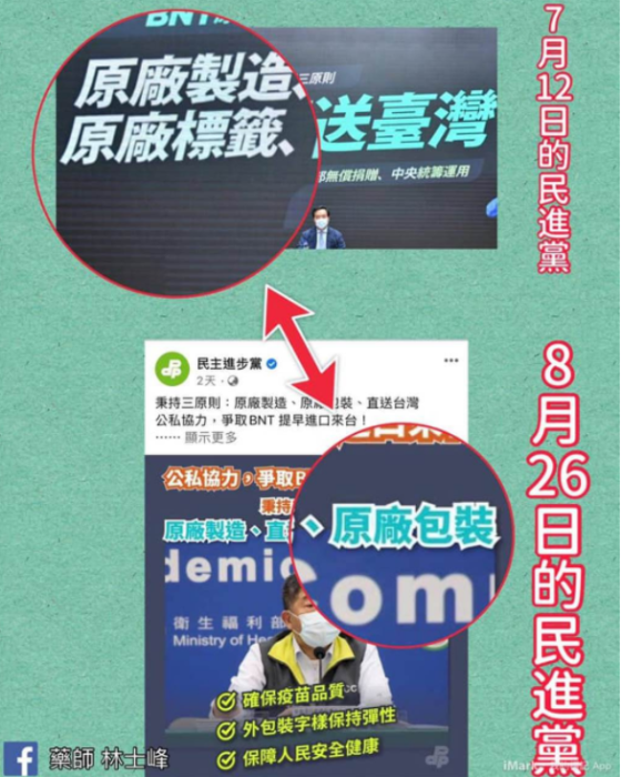 林士峰在臉書PO文先是提到,民進黨8月26日發(fā)文告訴全體民眾,會秉持三原則“原廠制造、原廠包裝、直送臺灣”,爭取BNT提早進口來臺。但他發(fā)現(xiàn),綠營上個月告訴大家的三原則并非如此。