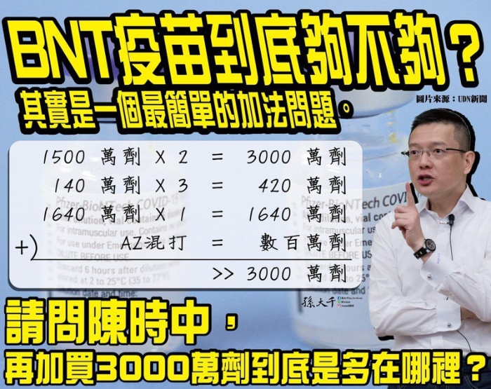 孫大千說,臺灣現(xiàn)在滿打滿算也只不過買到了1500萬劑的BNT疫苗,請問疫情流行指揮中心指揮官陳時中,再加買3000萬劑到底是多在哪里了?