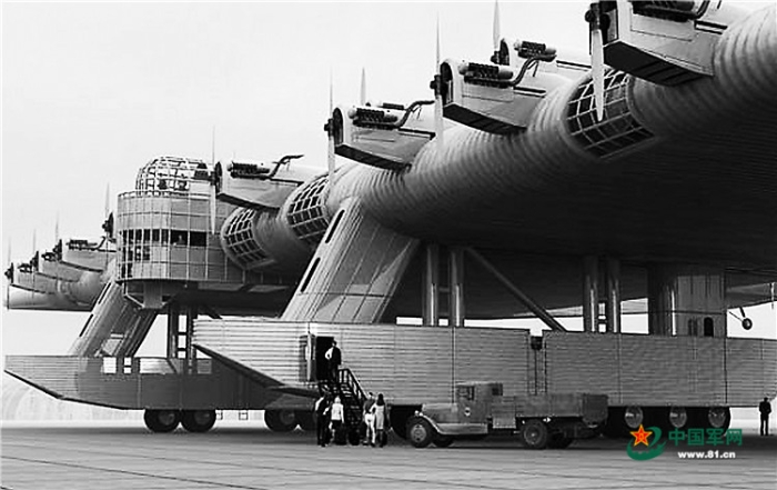 加里寧的自信源于創(chuàng)新設(shè)計(jì)。他打破傳統(tǒng)的飛機(jī)設(shè)計(jì)思路,將一些有效載荷分置在機(jī)翼內(nèi),將機(jī)翼和機(jī)身融為一體。為了帶動(dòng)K-7的巨大“體型”,加里寧安裝了7臺發(fā)動(dòng)機(jī),6臺在機(jī)翼前緣,1臺在尾部。飛行時(shí),修理技師可以快速排除發(fā)動(dòng)機(jī)故障。