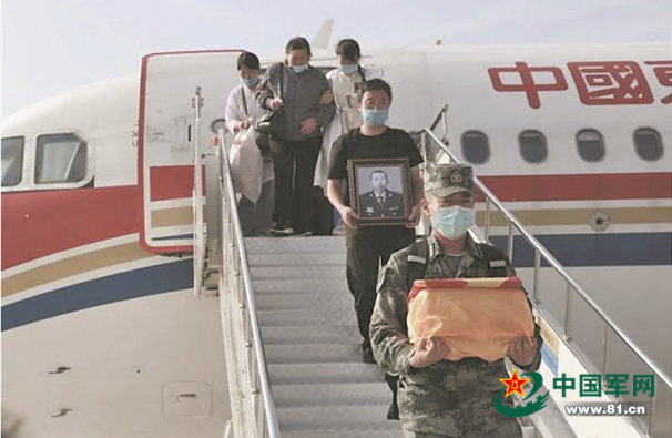 部隊領導及蘇萬飛的親屬護送英雄回家。
