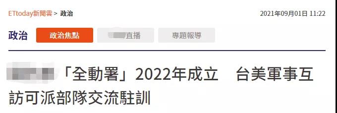 據(jù)臺灣“ETtoday新聞云”和其它臺媒9月1日消息,臺灣防務(wù)部門31日送交“立法院”的“2022年度防務(wù)預(yù)算書”提到要成立所謂“臺防務(wù)部門全民防衛(wèi)動員署(簡稱:全動署)”,當中還稱正在規(guī)劃“臺美軍事交流”,雙方互訪及小部隊駐訓(xùn)云云。
