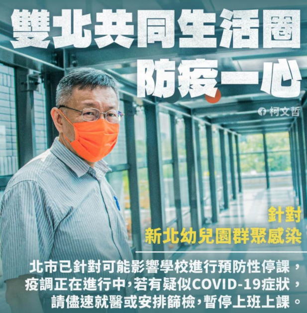 柯文哲昨晚在臉書(shū)發(fā)文指出,臺(tái)北市疫情持續(xù)趨緩,上周只有新增3例、上上周則是2例。正當(dāng)大家逐漸放下戒心時(shí),新北市突然爆發(fā)了幼兒園的群聚案,1位老師確診傳給8個(gè)小朋友及1位家長(zhǎng)。臺(tái)北市一看到消息,立刻與新北市衛(wèi)生局、疾病管制署聯(lián)系,先厘清被感染幼兒園學(xué)童的家長(zhǎng)是否有到臺(tái)北上班,影響范圍可能有多大。