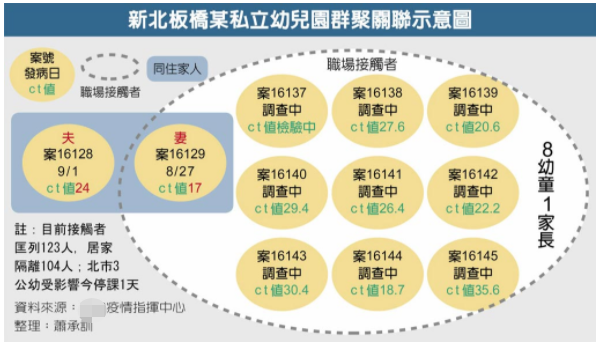 新北板橋某私立幼兒園群聚關(guān)聯(lián)示意圖 圖片來源:臺(tái)灣《中國時(shí)報(bào)》