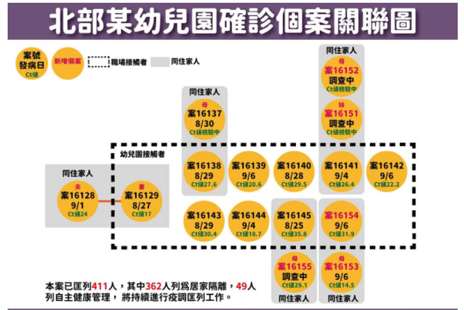 臺當局流行疫情指揮中心今(7)日公布臺灣新增12例確診,分別為8例本土及4例境外移入;另確診個案中無新增死亡。指揮官陳時中補充,幼兒園新增5例,3名家長,1名幼兒園學童,另一名則為幼兒園染疫學童的一歲妹妹,整起群聚累積16人確診,全案共匡列411人,其中362人居家隔離、49人自主健康管理。