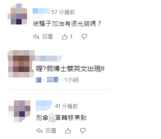 還有網(wǎng)友痛批,“喔?假博士蔡英文出現(xiàn)!”、“被騙子加油有很光榮嗎?” “別拿臺(tái)軍轉(zhuǎn)移焦點(diǎn)(指蔡英文論文造假丑聞)”↓