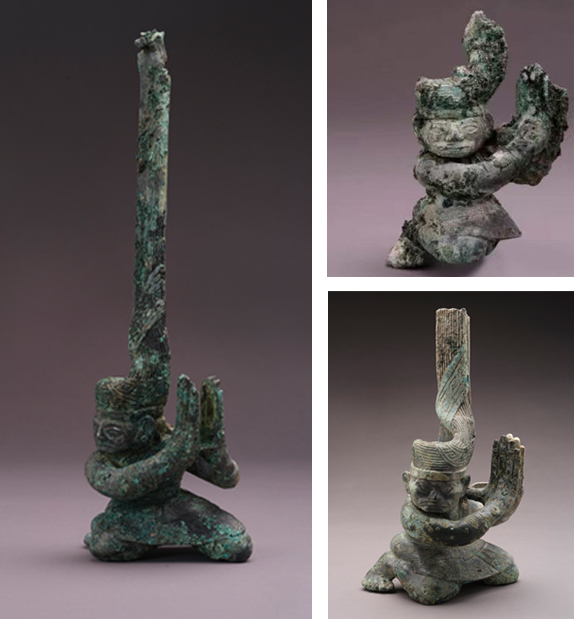 4號(hào)祭祀坑發(fā)現(xiàn)的這三件扭頭跪坐人像,通高約30厘米,人像呈雙膝跪坐姿勢(shì),身體略微前傾,頭扭向右側(cè),雙手則呈半合十狀平舉于左前方,中間有縫隙。這些人像頭頂盤發(fā)一周并從左側(cè)束發(fā)向上,另有一股頭發(fā)也是從左后肩“沖天”而上,兩股頭發(fā)的銅條大致平行,呈相對(duì)的凹槽狀,中有縫隙。人像兩手間的縫隙以及兩股頭發(fā)間的縫隙,共同構(gòu)成一個(gè)卡槽。考古工作者判斷,這3件人像應(yīng)該是屬于同一件器物,并共同構(gòu)成一個(gè)疑似三角形的形狀,起到支腳的作用。