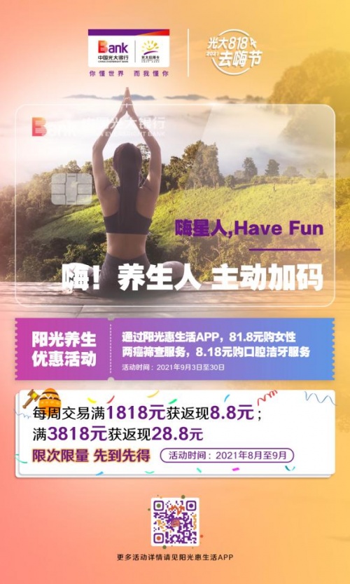 面對(duì)朋克養(yǎng)生一族們,光大信用卡愿意成為堅(jiān)定的支持者和溫暖的陪伴者。今年“光大818去嗨節(jié)”,特別搭建主題為“嗨!養(yǎng)生人”的健康消費(fèi)場景,聚焦年輕客群,推出口腔潔牙、女性健康體檢等服務(wù),盡顯光大信用卡作為金融央企的優(yōu)質(zhì)服務(wù)和民生關(guān)懷。