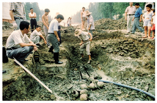 1998年8月18日,在一處建筑工地深挖過(guò)程中,意外挖出41個(gè)人頭骨和大量肢骨,現(xiàn)場(chǎng)散發(fā)刺鼻氣味。侵華日軍南京大屠殺遇難同胞紀(jì)念館時(shí)任館長(zhǎng)朱成山,當(dāng)時(shí)正在外地出差,一通電話后,他立即趕回南京。