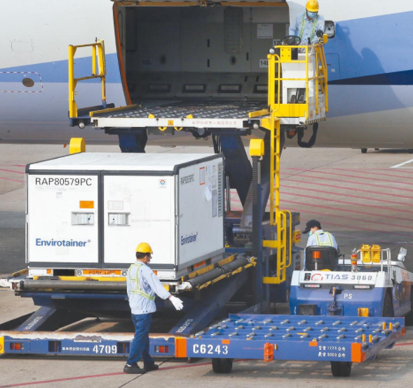 臺(tái)灣地區(qū)自購(gòu)的64萬(wàn)劑AZ疫苗由班號(hào)CI834的華航班機(jī)載運(yùn),從泰國(guó)曼谷出發(fā)后,17日下午15時(shí)25分抵達(dá)桃園機(jī)場(chǎng),班機(jī)落地停靠機(jī)坪后,待機(jī)艙內(nèi)外消毒完畢,地勤人員立刻從機(jī)艙卸下裝載疫苗的冷凍貨柜。(圖片來(lái)源:臺(tái)灣《中國(guó)時(shí)報(bào)》)