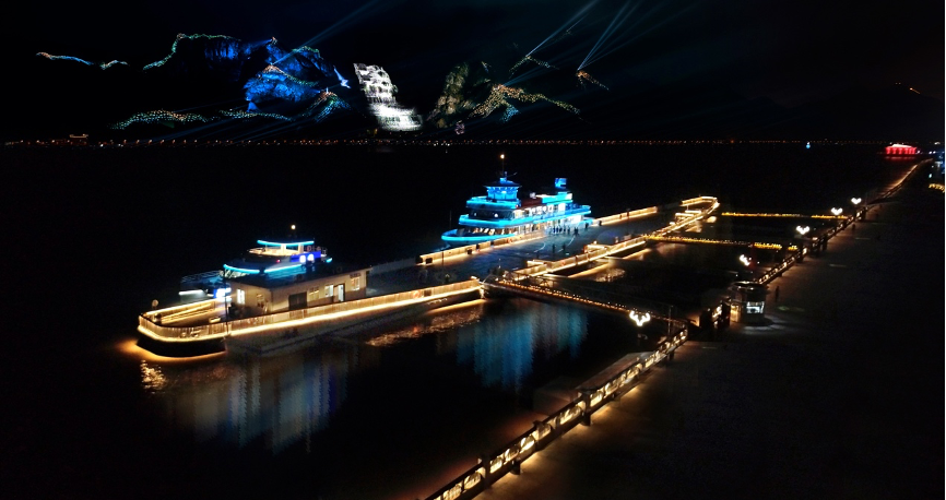 甌江夜游共獲得三項(xiàng)吉尼斯世界紀(jì)錄――“世界最大山體燈光秀”、“世界最大光瀑布”、 “世界最大的永久性水幕投影”,是視覺、聽覺的全方位震撼體驗(yàn)?!碧梁右巩嫛笔侵袊撞砍鞘杏洃浿黝}行進(jìn)式夜游演出,登上畫舫,船身動,緩緩穿越千年,成為溫州新一代網(wǎng)紅打卡的地標(biāo)。