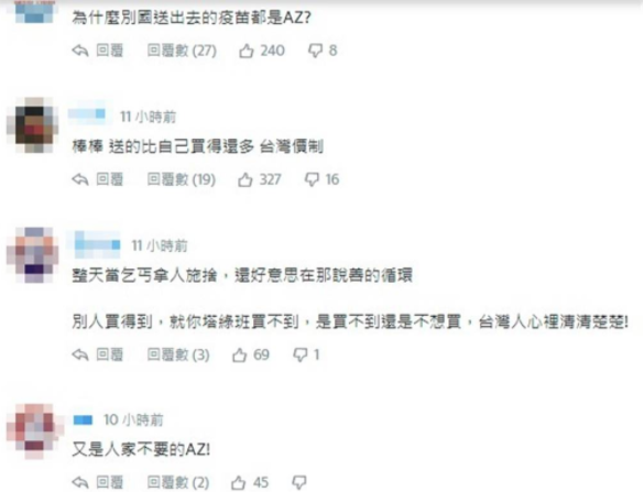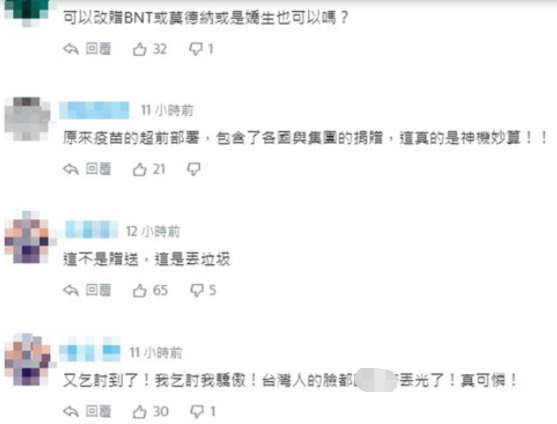 斯洛伐克政府24日宣布,將捐贈(zèng)臺(tái)灣地區(qū)16萬劑AZ疫苗,對(duì)此蔡英文辦公室發(fā)言人張惇涵表示,斯洛伐克原本宣布捐贈(zèng)1萬劑疫苗,后來提高捐贈(zèng)數(shù)量至16萬劑,再次誠(chéng)摯感謝斯洛伐克的真摯友誼。但消息曝光后,引發(fā)島內(nèi)網(wǎng)友熱烈討論,但許多網(wǎng)友卻又想到民進(jìn)黨當(dāng)局采購(gòu)疫苗到貨遠(yuǎn)不如外國(guó)與民間企業(yè)捐贈(zèng),怒火燃起,紛紛在《中時(shí)電子報(bào)》新聞下留言嘲諷“疫苗乞丐”、“棒棒,送的比自己買得還多,臺(tái)灣價(jià)值”、“整天拿人施舍”。