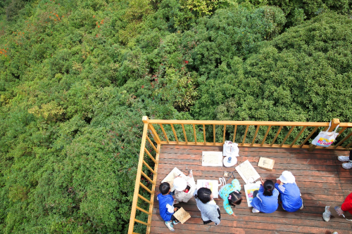 除了在“教室里”的美術(shù)課,萬家還引導(dǎo)孩子們走出戶外。在納雍當(dāng)?shù)氐膰覞竦毓珗@,志愿者美術(shù)老師向孩子們傳授寫生技巧。孩子們拿起了稚嫩的畫筆,描繪出貴州的青山綠水,用自己的眼睛去認(rèn)識(shí)美、發(fā)現(xiàn)美、創(chuàng)造美。