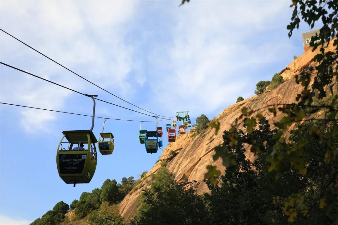 你可以乘坐高空纜車,俯瞰腳下綿延的云蒙山山脈,或高或矮的山巒被秋色浸染,草木樹葉打成卷如星辰灑落在滿目金色里。