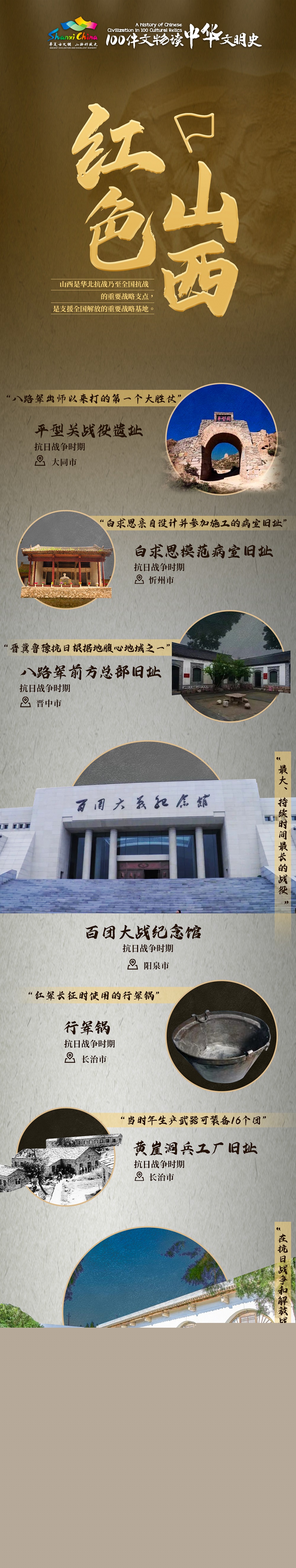 如何打卡這些紅色革命文物呢?我們精心安排好了打卡路線。首先去山西省大同市的「平型關(guān)戰(zhàn)役遺址」打卡;接下來到忻州市「白求恩模范病室舊址」打卡;之后到與忻州市接壤的呂梁市陽泉市分別打卡「晉綏邊區(qū)政府及軍區(qū)司令部舊址(晉綏邊區(qū)革命紀(jì)念館)」和「百團(tuán)大戰(zhàn)紀(jì)念館(碑)」;最后來晉中市打卡「八路軍前方總部舊址」和去長(zhǎng)治市打卡「黃崖洞兵工廠舊址」「行軍鍋」?!凹t色山西”的這些紅色革命文物,是抗日戰(zhàn)爭(zhēng)時(shí)期人們?yōu)閷?shí)現(xiàn)民族獨(dú)立和人民解放時(shí)所留下來的,它們的存在是要讓我們將“勿忘國(guó)恥,振興中華!”的警語時(shí)刻牢記心中!