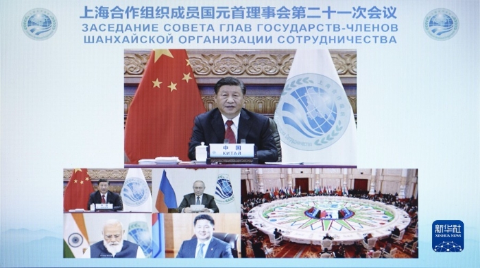 9月17日,國家主席習(xí)近平在北京以視頻方式出席上海合作組織成員國元首理事會第二十一次會議并發(fā)表重要講話。新華社記者 劉彬 攝