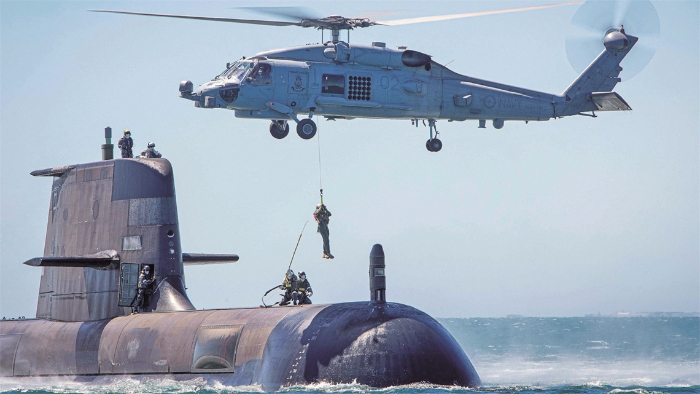 澳大利亞柯林斯級(jí)潛艇與MH-60R“海鷹”直升機(jī)進(jìn)行演練