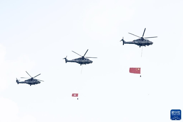 10月1日,香港特區(qū)政府在金紫荊廣場舉行升旗儀式。這是特區(qū)政府飛行服務隊直升機懸掛著國旗和區(qū)旗飛過維港上空。