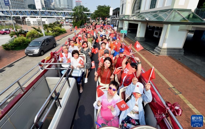 10月1日,在香港街頭,參加慶祝國慶巴士巡游的人們揮動國旗和香港特區(qū)區(qū)旗。