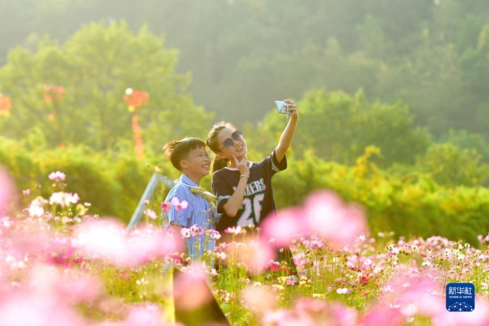 10月5日,在湖南省婁底市雙峰縣青樹坪鎮(zhèn)歸古國際旅游度假區(qū),兩名小朋友在花海中拍照。