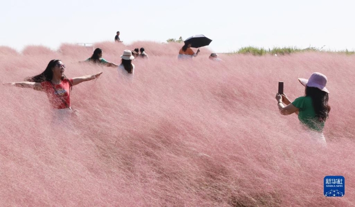 10月5日,游客在江蘇蘇州陽澄湖半島的粉黛亂子草叢中游玩。