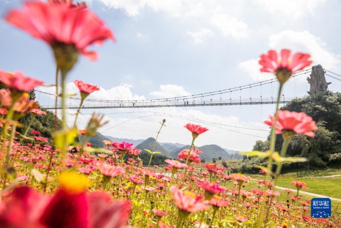 10月5日,游客在貴州省畢節(jié)市百里杜鵑管理區(qū)彝山花谷景區(qū)玻璃橋上觀景游玩。
