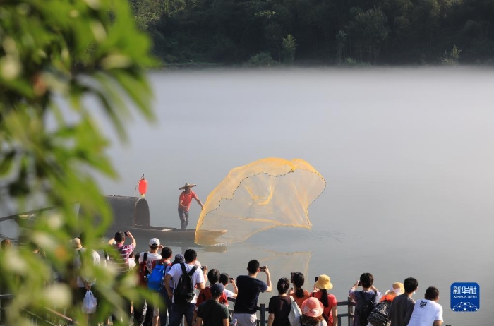 10月5日,游客在湖南省資興市東江湖旅游區(qū)欣賞漁夫撒網(wǎng)表演。
