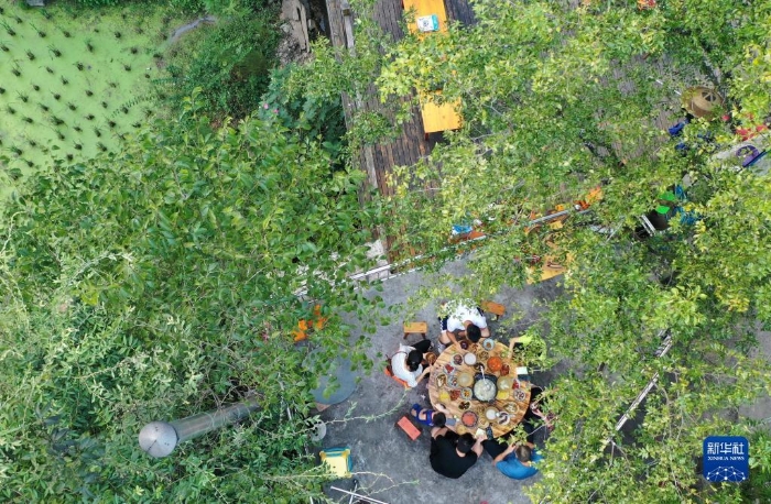 10月5日,在貴州省劍河縣革東鎮(zhèn)屯州村,游客在農(nóng)家樂就餐(無人機(jī)照片)。