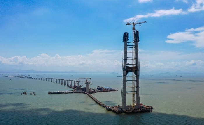 ? ?由中交二航局承建的深中通道伶仃洋大橋東索塔(7月1日攝)。新華社記者 劉大偉 攝