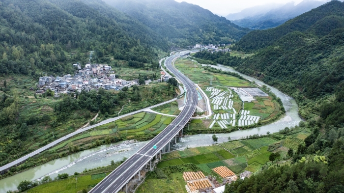 ? ?車輛行駛在秀印高速公路木黃至梵凈山路段(8月15日攝,無人機(jī)照片)。新華社記者 陶亮 攝