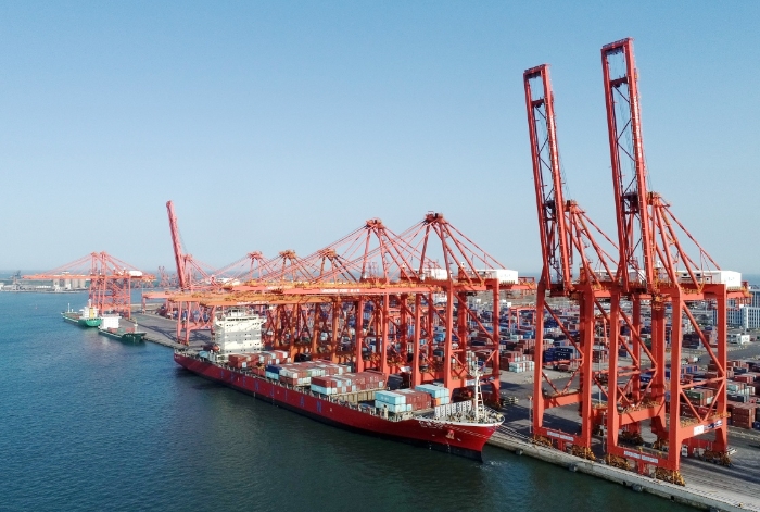? ?一艘輪船靠泊在唐山港京唐港區(qū)集裝箱碼頭裝貨(4月8日攝,無人機(jī)照片)。新華社記者 楊世堯 攝