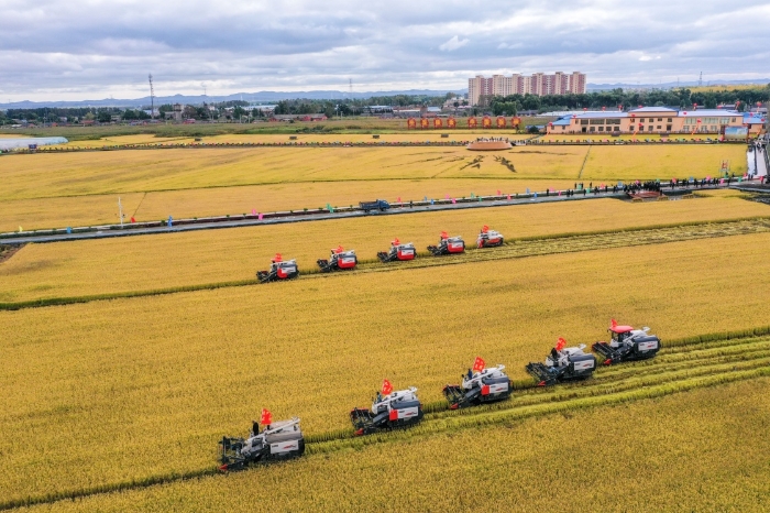 ? ?在吉林省長春市九臺區(qū)龍嘉街道紅光村,農(nóng)民駕駛農(nóng)機(jī)進(jìn)行水稻收割作業(yè)(9月23日攝,無人機(jī)照片)。新華社記者 張楠 攝