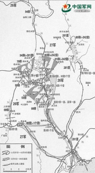 11月26日,9兵團20軍四個師(第58、59、69和89師)和27軍的三個師(第79、80和81師)共約八萬人,以驚人的毅力克服缺衣少食的困難,悄然進入攻擊位置。27軍第94師和26軍也開始從厚昌地區(qū)向長津湖開進。