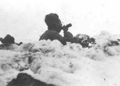 1950年11月28日,我59師177團6連奉命固守死鷹嶺高地,配合第27軍阻擊南逃之敵。“戰(zhàn)斗打響后,該連無一人站起,到打掃戰(zhàn)場時發(fā)現(xiàn),全連干部、戰(zhàn)士呈戰(zhàn)斗隊形全部凍死在陣地上,細查尸體無任何傷痕與血跡?!?nbsp;整連129個志愿軍官兵在伏擊任務中被凍成了冰雕。在零下40攝氏度的陣地上,“冰雕連”官兵把身子死死地鉚在陣地上,展開戰(zhàn)斗隊形將槍口一致朝著美軍途經的方向,許多戰(zhàn)士的手凍結在槍托上掰不開。戰(zhàn)后,兄弟部隊在這些犧牲戰(zhàn)士的遺物中,發(fā)現(xiàn)了一位名叫宋阿毛的戰(zhàn)士所寫的絕筆詩:我愛親人和祖國,我更愛我的榮譽,我是一名光榮的志愿軍戰(zhàn)士,冰雪啊,我絕不屈服于你,哪怕是凍死,我也要高傲的聳立在我的陣地上。