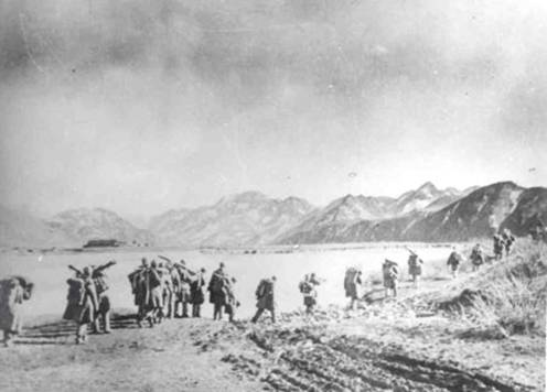 △志愿軍第40軍一部行進在清川江邊。圖源:中國軍網(wǎng)