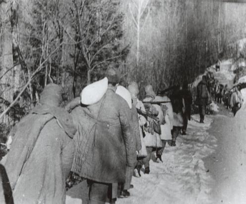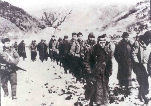 △志愿軍第38軍一部在嘎日嶺痛擊“聯(lián)合國軍”。圖為志愿軍將俘虜押下戰(zhàn)場。圖源:中國軍網(wǎng)