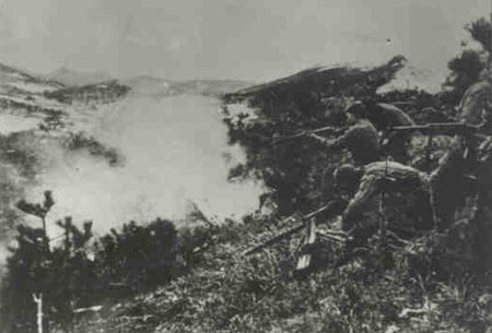 西線展開激戰(zhàn)的同時,東線以高寒的長津湖畔山區(qū)為中心,志愿軍對美軍展開一場圍殲戰(zhàn)。11月中旬,美國海軍陸戰(zhàn)第1師和美第7師一部沿著咸興——江界公路,向北推進至長津湖一帶。11月27日晚,隱蔽進入長津湖東西兩側(cè)的我第9兵團突然以8個師發(fā)起攻擊。經(jīng)過一夜戰(zhàn)斗,把一條長蛇似的美軍割成五段。敵遭志愿軍分割包圍后,立即以200余輛坦克在三個主要被圍點構(gòu)成環(huán)形防御,并通過臨時機場運走傷兵和運來彈藥、御寒裝備。由于志愿軍主要依靠步兵火力攻堅,雖然在夜間再一次突入敵陣地,可是天亮前卻總是無法解決戰(zhàn)斗,為防敵空襲只好一次次撤出。
