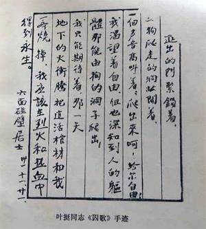 在皖南事變中,葉挺在奉派與國民黨軍交涉時被強行扣押。此后在上饒、桂林、重慶、恩施等地度過了五年零兩個月的囚禁生活。蔣介石親自出馬進行“勸導(dǎo)”,要任命他為國民黨軍的戰(zhàn)區(qū)司令長官??墒侨~挺冷冷地回答:“若是放我出去,我還是要去當(dāng)新四軍軍長。” 他不懼國民黨威逼利誘,堅守一個共產(chǎn)黨人的人格,寫信表示“個人之操守至死不可變”,作《囚歌》以明志: