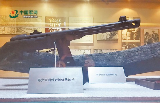 邱少云潛伏時被燒毀的槍,以及他身邊被燒焦的樹。王雪振攝