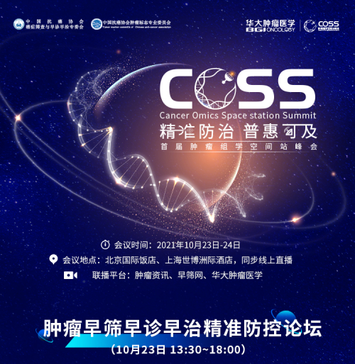 為助力我國癌癥精準防治,2021年10月23-24日,由中國抗癌協會腫瘤標志專業(yè)委員會、中國抗癌協會癌癥篩查與早診早治專委會擔任學術支持單位,華大基因主辦的“精準防治 普惠可及-首屆腫瘤組學空間站峰會(COSS,Cancer Omics Space station Summit)”將在北京、上海兩地聯動召開,并同步線上直播。