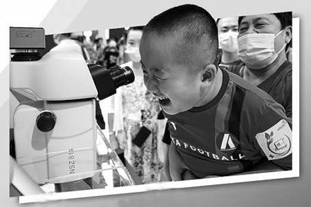 觀眾通過顯微鏡看月壤多型探測(cè)感知裝備產(chǎn)品參展,“首次”“首度”繼續(xù)成為熱詞