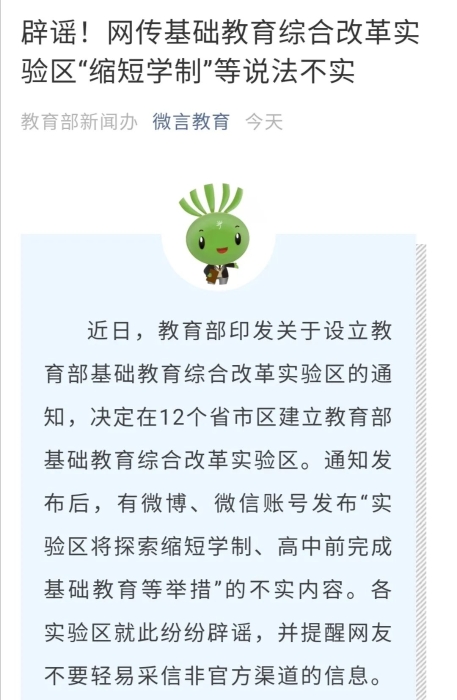 針對沸沸揚揚的“大尺度”學制改革傳言,各基礎(chǔ)教育綜合改革實驗區(qū)均予以辟謠。10月18日,教育部官微“微言教育”也轉(zhuǎn)發(fā)了相關(guān)內(nèi)容,稱“實驗區(qū)將探索縮短學制、高中前完成基礎(chǔ)教育等舉措”內(nèi)容不實,并提醒網(wǎng)友不要輕易采信非官方渠道的信息。