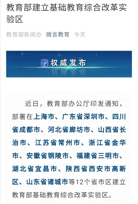 ▲10月18日,教育部官微“微言教育”同時發(fā)布了“教育部建立基礎(chǔ)教育綜合改革實驗區(qū)”的消息,但改革內(nèi)容并不涉及學制變動。圖/“微言教育”公號截圖