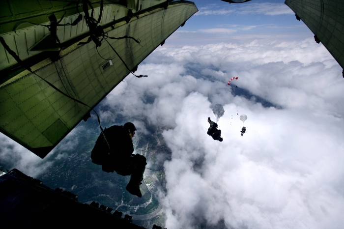 15名空降兵從地震災區(qū)四川茂縣上空4999米的高空奮不顧身跳下,進入道路阻斷的災區(qū)參加救援(2008年5月14日攝)。新華社發(fā)(劉應華 攝)