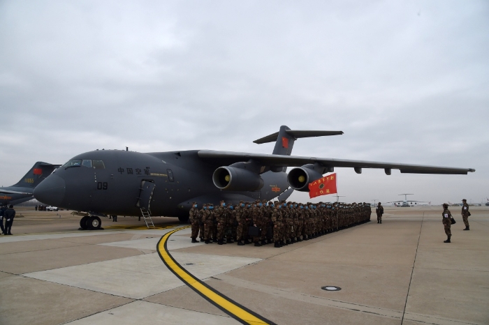 一批增援武漢的軍隊醫(yī)護人員乘坐國產(chǎn)運-20運輸機抵達武漢天河機場(2020年2月13日攝)。新華社記者 黎云 攝