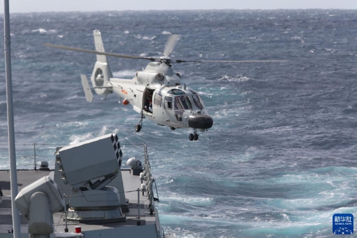 當(dāng)?shù)貢r間10月23日,中俄首次海上聯(lián)合巡航艦艇編隊在東海東部海域舉行分航儀式。這是中方艦載直升機從南昌艦上起飛。新華社發(fā)(韓成攝)