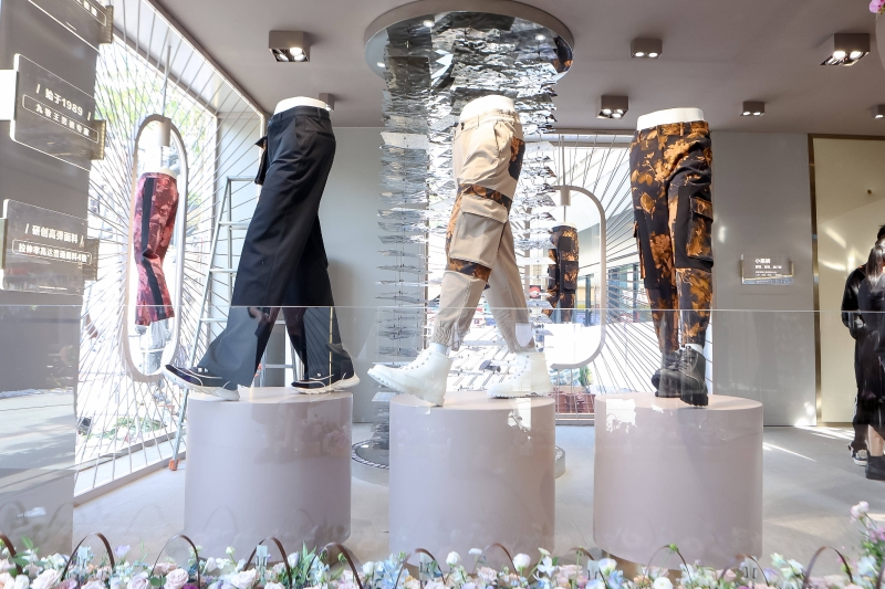 在鏡面、金屬、光影營(yíng)造的機(jī)械科技感中,繽紛多彩、款式多樣的九牧王男褲是壓場(chǎng)的存在。店內(nèi)最為吸睛的一幕,莫過于店中心頂部,環(huán)繞排列著邁步姿勢(shì)的各式男褲,傳遞九牧王每7秒便賣出一條③的熱銷成績(jī)。店內(nèi)還有運(yùn)用針線、面料等元素的創(chuàng)意造景,詮釋九牧王匠心工藝與行業(yè)實(shí)力,非常值得前來實(shí)地體驗(yàn)、探索解讀。