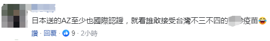 有網(wǎng)友毫不留情的表示,日本送的AZ至少也(是)國(guó)際認(rèn)證,就看誰(shuí)接受臺(tái)灣“不三不四”的自產(chǎn)疫苗?!?/p>