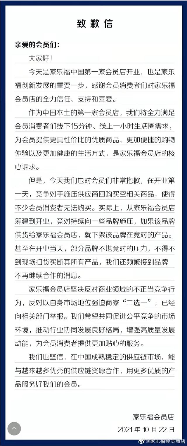 ▲22日,@家樂福會(huì)員商店在微博發(fā)布致歉信,稱從其籌建到開業(yè),競爭對手持續(xù)向一些品牌施壓,如果該品牌供貨給家樂福會(huì)員店,就下架該品牌在競爭對手的產(chǎn)品,家樂福已經(jīng)向相關(guān)部門舉報(bào)。圖/@家樂福會(huì)員微博截圖