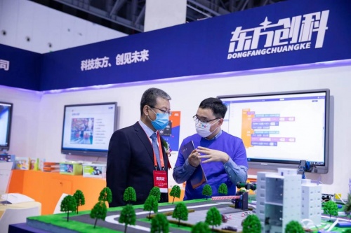 中國教育技術(shù)協(xié)會學(xué)術(shù)委員會副主任、中國國際科技促進(jìn)會青少年人工智能教育普及工作委員會專家委員會副主任、北京電化教育館原館長、特級教師潘克明蒞臨東方創(chuàng)科展位