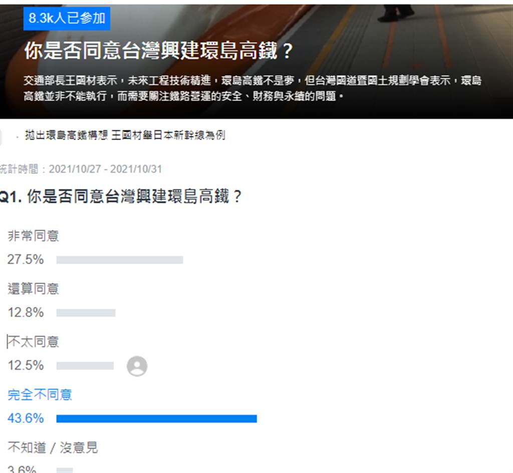 對于臺灣是否該興建環(huán)島高鐵,入口網(wǎng)站《Yahoo奇摩》27日就對此發(fā)起網(wǎng)絡投票民調(diào),以“你是否同意臺灣興建環(huán)島高鐵?”為題詢問廣大網(wǎng)友看法,投票時間為10月27日至31日,截至27日晚間11時30分為止,共有8300多名網(wǎng)友投票,列出5個選項,表示“非常同意”,比例占27.5%;“還算同意”占12.8%,共有40.8%的網(wǎng)友傾向“需要”。“不太同意”占12.5%、“非常不同意”占43.6%,有56.1%的網(wǎng)友傾向“不同意”,另“不知道/沒意見”占3.6%。